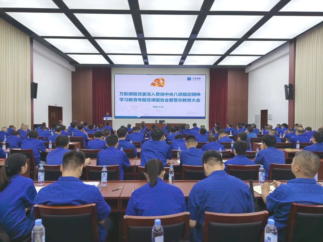 7月25日,萬航模鍛黨委召開深入貫徹中央八項(xiàng)規(guī)定精神學(xué)習(xí)教育專題黨課報(bào)告會暨警示教育大會。中國二重黨委委員、副總經(jīng)理,萬航模鍛黨委書記、董事長向彪以《以永遠(yuǎn)在路上的恒心和韌性,一刻不停推進(jìn)作風(fēng)建設(shè)》為題作專題黨課報(bào)告,并開展警示教育。萬航模鍛黨委委員、副總經(jīng)理張鵬主持會議。萬航模鍛黨委開展“心向黨·七個(gè)一”主題系列活動2025-08-20